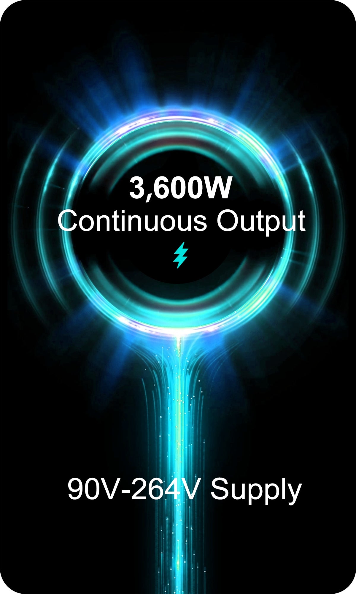 With 3.6KW continuous output power, it can meet the household daily power demand. Supports from 90V to 264V power output.