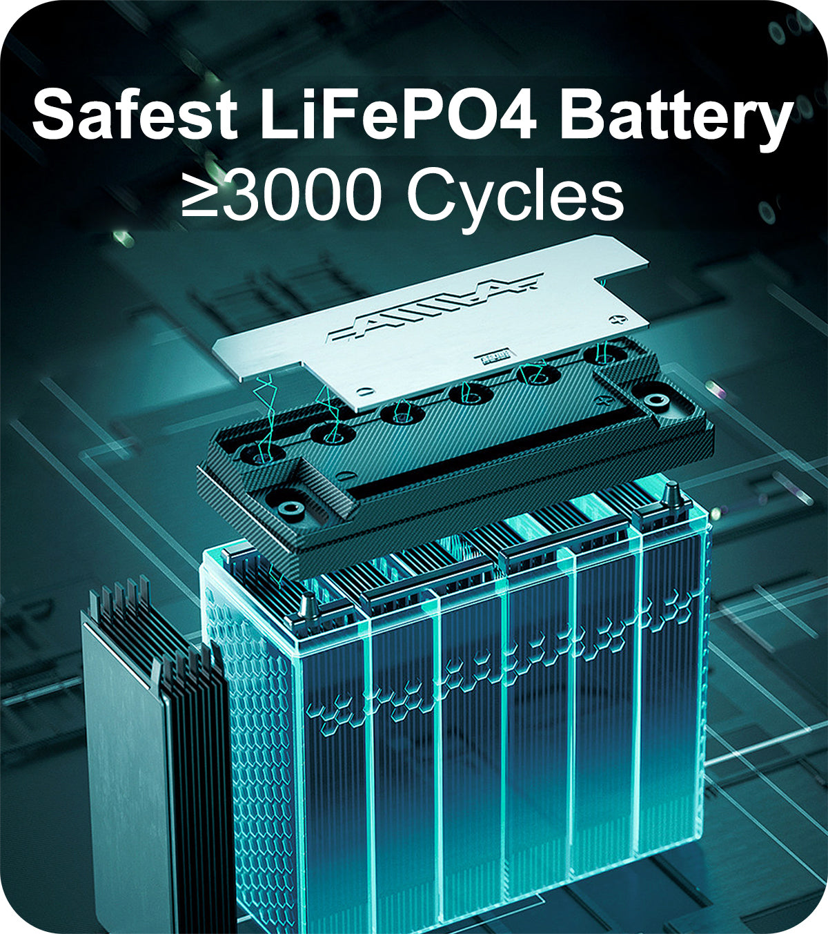 It adopts high quality LiFePO4 (lithium iron phosphate) battery, which can reach 3000 cycles and has excellent safety and stability.