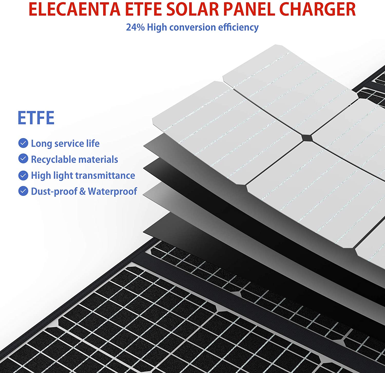 • DURABLE & IPX5 WATERPROOF: Made of high-quality ETFE laminate material, making the solar panel durable.